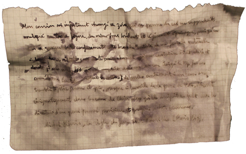 Du pied Asteur poussa un carton, héritage de l’ichtioandre dégoûté. On y trouvait du granulat de chaux sodée en bidon, une carte publicitaire pour les cigarettes Mélia avec un portrait de G. Lantelme, un bloc de plomb (fabrication artisanale), une notice manuscrite citant un passage où l’auteur de “La règle du jeu” évoquait l’actrice précitée, un dessin primitif du cours du Rhin à hauteur de Rees, des coupures de journaux, un émerillon, des manilles en acier ou textiles, une boîte de Paracétamol entamée, un masque de plongée dépourvu de sangle, un catalogue de l’Hotel Druot (Objets d’art et d’ameublement, tapisseries, tableaux, gravures, bijoux), une chaussette, une carte postale (La Marne et le quai des Moulins. Le Yacht Aimée). Un dessin caricatural au crayon bille représentait une femme basculant par une fenêtre sur le rebord de laquelle on suppose qu’elle prenait un bol d’air avant que de boire la tasse. La présence, atypique en matière de construction navale, de fenêtres à double montants, visibles sur la carte postale, à la place de hublot, rendait la chute plausible. Ni homme ni grenouille, je délaissai la plus grande partie du leg, malmené par l’humidité, pour tacher de déchiffrer la citation et une coupure. La première m’apprenait qu‘eau et encre ne s’accorde pas, la seconde, que le caveau de G. Lantelme avait reçu la visite de cambrioleurs, vaine en l’occurence, puisqu’ils n’y avaient pas trouvé le trésor convoité. Tout cela datait. Mais puisqu’entretemps j’avais envisagé de ramener la figure de l’homme préhistorique à Néanderthal, rien ne m’empêchait de pousser jusqu’à Rees, et de là, pourquoi pas, continuer jusqu’à Emmerich, dont les armoiries s’ornent d’un seau.