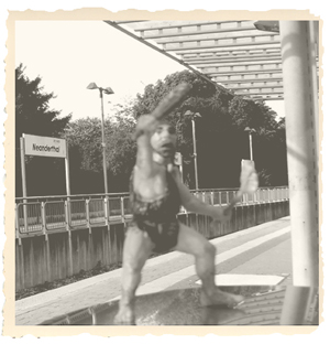 Entretemps nous avions franchi la frontière et filions à quelques kilomètres au nord d’Engis, nom qui démériterait pas de figurer à côté de celui Neanderthal. Mais. Et si... Les os décrits par le Dr. Schaafhausen, puis Fuhlrott eurent tout simplement occupé quelque 15,30 m² au bord la Düssel, c’est tout. Autrement baptisée, c.a.d. Engis, la calotte n’en aurait pas moins provoqué de remous autant dans les laboratoires que dans les chapelles. Pro ou contra ceci cela, les érudits se seraient tout autant penchés sur le mystère du torus circumorbitaire, eurent pareillement jonglé avec l’acromégalie, le prognathisme et autre dolichocephalie, l’encyclopédie anarchiste eut continué de croire en Homo Glozelensis, Albert-Eugène Lachenal de ferrailler contre le matérialisme, le Bulletin mensuel de Saint-Antoine de Padoue d‘affronter la théorie de l’évolution, le crâne de tel voleur eut pour Cesare Lombroso conservé les qualités qui le destinaient à ne pas devenir un inspecteur de police, et toutes ces pages noircies n’en voleteraient pas moins dans l’air, ainsi les plumes dans le poulailler après la visite du renard. Elles recouvraient le sol comme une première neige avant que de fondre. On avait fait du chemin, sans être beaucoup avancé. Pour ma part, je traversai une nouvelle frontière en feuilletant une revue scientifique. Le vocabulaire accusait une technicité proportionnelle au progrès des méthodes de recherche. L’équilibre entre la somme des données accumulées et le nombre de questions qu’elles continuaient de soulever restait sans doute le seul acquis véritable. Si la communauté scientifique s’entendait à remettre avec plus en plus de précison Homo Neanderthalensis à sa place, la divergence quant à sa position par rapport à Homo Sapiens restait. Trop proche pour les uns, trop éloignée pour les autres. Appuyant sur le bouton des portes du train désormais régional, je déclenchai l’ouverture d’icelles et me retrouvai face à l’ancienne gare. Rien de bien exitant pour l’humanité, un petit évènement pour moi, ou plutôt, la figurine. Sensibilisé peut-être par l’endroit, considérant le va-et-vient sur le quai, je me demandai si l’évolution pouvait revenir à arrière, à savoir, notant le nombre de personnes occupées à mastiquer, qui une brioche, qui un sandwiche, qui une barre vitaminée, si cette activité (qui implique l’action coordonnée des mâchoires et des mains) ne risquait pas nous faire recouvrir l’état dont la bipédie nous avait libéré. Il est vrai qu’une main seule était associée à l’ingurgitation, en ce qu’elle maintenait à une hauteur adéquate, la barre, le sandwiche ou la brioche, alors que l’autre serrait fermement un portable positioné, lui, au niveau du nombril.